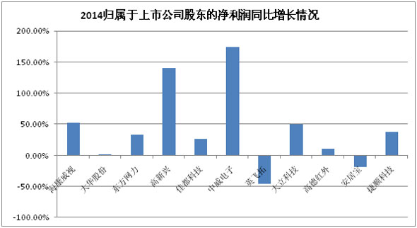 2014年,初登资本市场的东方网力表现不俗,实现营业收入6.40亿元,同比增长46.48%,实现利润总额1.58亿元,同比增长37.59%,归属于上市公司普通股股东的净利润1.36亿元,同时公司正逐步借助互联网拓展民用安防业务。高新兴正在实现主营业务转型,目前公司以城市安防、通信安防、金融安防为三大板块的安防业务已超过公司原有通信业务,2014实现营业收入7.37亿元,比上年增长37.35%,营业利润和净利润分别为7226.20万元和1.34亿元,分别比上年增长61.50%和127.83%。同样在2014年实现业务重组并且安防成为公司两大核心之一的佳都科技实现营业收入 22.65亿元,归属于母公司所有者的净利润 1.15亿元,同比增长26%。中威电子同样实现了净利润翻倍,2014年公司实现营业收入2.03亿元,比上年增长70.47%,营业利润为3294.11万元,比上年同期增长350.70%,利润总额4748.76万元,比上年同期增长178.25%。归属于普通股股东的净利润比上年同期增加了174.53%。