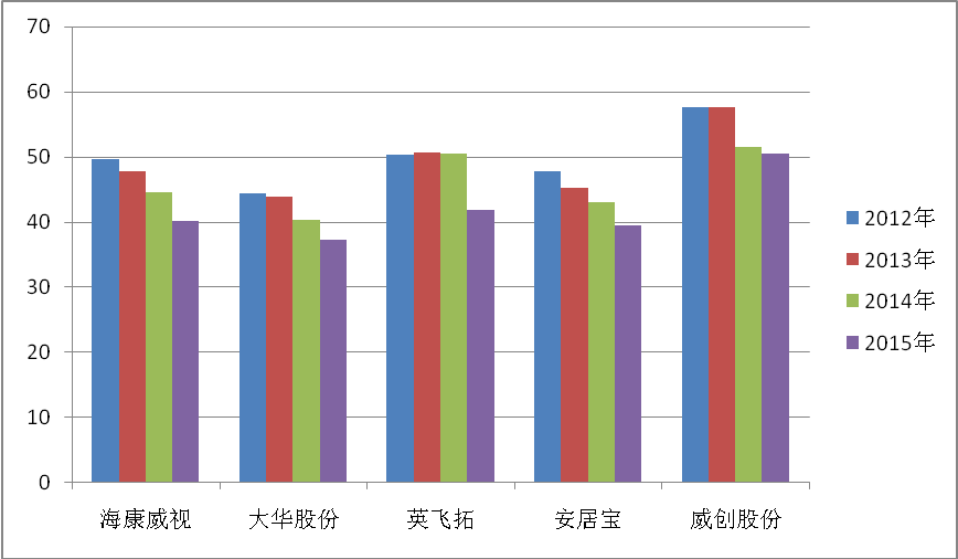 我们以视频监控行业为例从2012年以来到2015年,海康威视视频监控业务整体毛利率都在呈下降趋势,尤其是2015年毛利率水平下降4.3个百分点至40.1%,其中第三季度和第四季度均低于40%。大华股份年收入增长率、净利润增长以及毛利率方面都在呈下降趋势,2015年毛利率水平低于40%,下降到37.2%。以楼宇对讲为主营业务的安居宝,2012-2015年四年间企业毛利率都在呈下降趋势,楼宇对讲行业也陷入产品同质化、价格战等激烈的行业内部竞争中,再加上海康威视、大华股份等企业强势拓展楼宇对讲业务,安居宝在2014年启动企业转型升级,涉足互联网项目。从近4年安防产品制造上市企业盈利能力的变化趋势来看,毛利率、净利润增长都有所放缓,企业盈利能力正逐年下降,上市公司尚且如此,盈利能力远远低于上市公司的中小型安防企业,盈利能力下降更严重,迫使一些企业难以为继。这也反映了行业竞争在加剧。