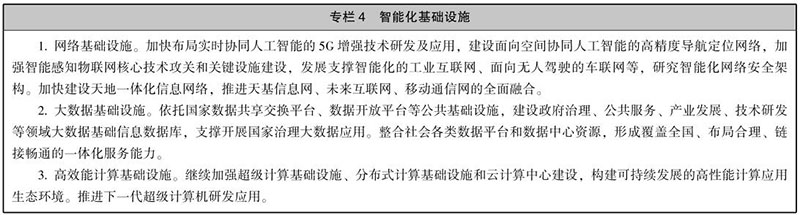 大力推动智能化信息基础设施建设,提升传统基础设施的智能化水平,形成适应智能经济、智能社会和国防建设需要的基础设施体系。加快推动以信息传输为核心的数字化、网络化信息基础设施,向集融合感知、传输、存储、计算、处理于一体的智能化信息基础设施转变。优化升级网络基础设施,研发布局第五代移动通信(5G)系统,完善物联网基础设施,加快天地一体化信息网络建设,提高低时延、高通量的传输能力。统筹利用大数据基础设施,强化数据安全与隐私保护,为人工智能研发和广泛应用提供海量数据支撑。建设高效能计算基础设施,提升超级计算中心对人工智能应用的服务支撑能力。建设分布式高效能源互联网,形成支撑多能源协调互补、及时有效接入的新型能源网络,推广智能储能设施、智能用电设施,实现能源供需信息的实时匹配和智能化响应。