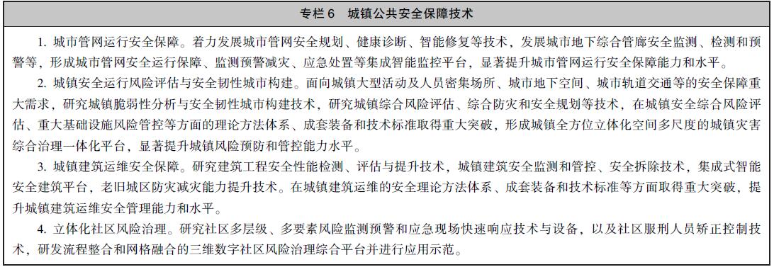 围绕城镇建筑、管网、社区等的安全保障,以及城镇综合风险等方面,系统化开展基础理论和应用基础研究、共性关键技术攻关与应用示范。力争到2020年形成较为完备的城镇公共安全保障的理论体系、标准规范体系、共性关键技术体系,增强城镇抵御自然灾害、处置突发事件和危机管理能力,切实保障城镇安全。