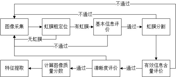 采集到的虹膜图像分别经过虹膜粗定位、基本信息评价、虹膜分割、有效信息评价、清晰度评价、计算图像质量分数等6个步骤,虹膜粗定位、基本信息评价、有效信息评价、清晰度评价4个步骤中任一步骤不通过均代表该帧图像不符合要求,需要重新采集。