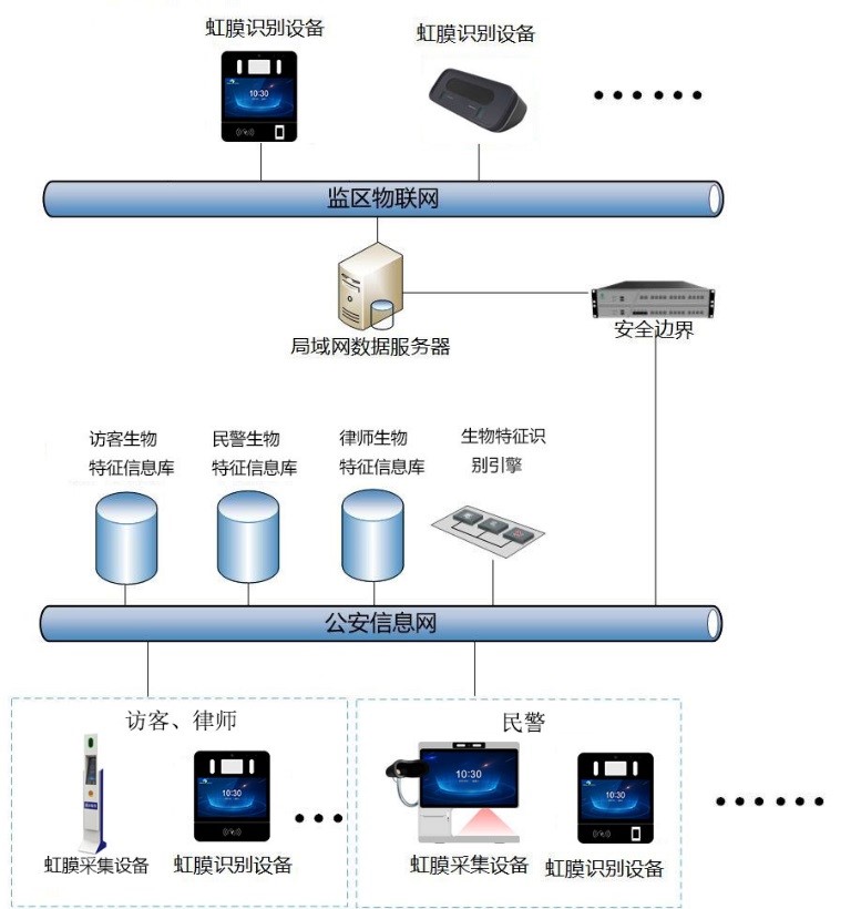 结合实际落地的应用项目,本文提出了一整套公安智慧监管业务中的虹膜识别应用解决方案,包括虹膜采集核验设备、虹膜识别引擎、虹膜特征信息库等组成部分。解决方案整体架构图如图3所示,主要功能包括:
