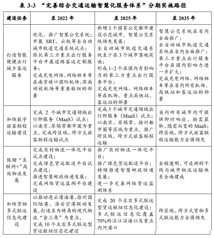运输服务全链化。以出行链为核心打造数字化出行助手,规划发展村庄全部实现地图精准导航,完成城市交通领域出行即服务(MaaS)试点,提供一票/一码的市内全方式出行服务,以南京、苏锡常、徐州都市圈等为重点完成区域间旅客联程试点,推广全程“一站式”服务。提供跨方式、跨区域的全程物流信息服务,多式联运信息化覆盖70%的沿江沿海以及重点内河港口,集装箱运输电子运单使用率超过85%,实现全程“一单制”服务。