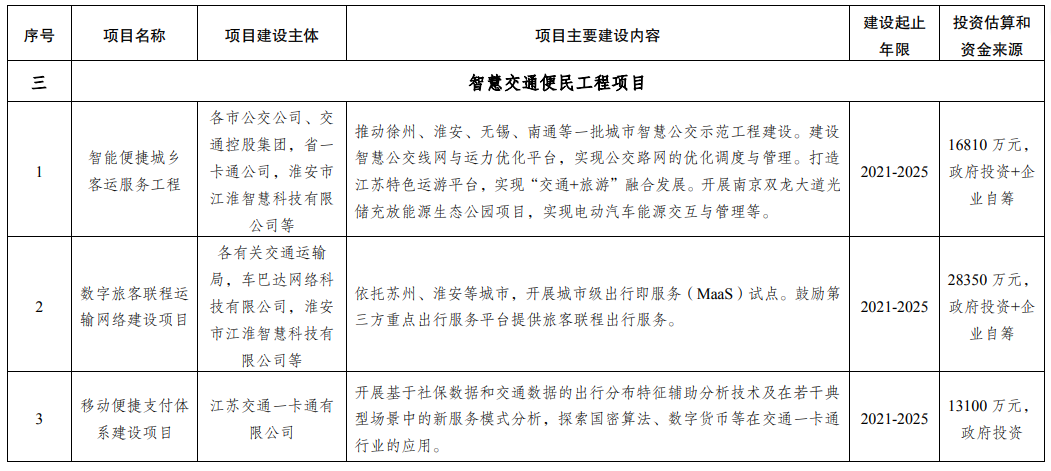 推广智慧公交系统。推动徐州、淮安、无锡、南通等一批城市智慧公交示范工程建设。加大公交信号优先系统、电子站牌等推广力度,试点建设智慧公交云平台,形成涵盖人—车—站—线的智慧公交出行网络。推动SRT、智轨等全自动城市轨道交通系统、智能调度系统及智能运维系统应用。推进城乡公交线路配置和运营调度“一张图”、城乡公交智能信息服务“一张网”、城乡居民出行共用“一张卡”、城乡公交服务质量“一个标准体系”。